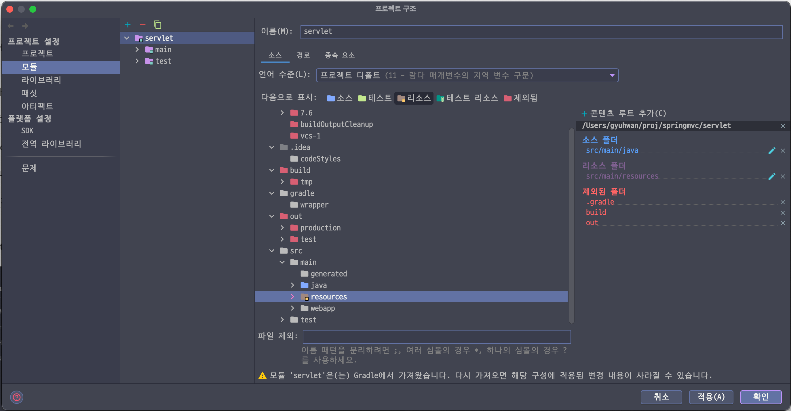 모듈에서 소스와 리소스 폴더, 제외 폴더를 잡아줍니다.