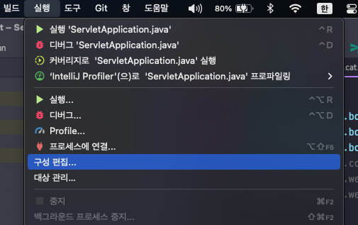 실행에서 구성 편집을 들어갑니다. 오른쪽 상단의 빌드 모양 오른쪽 드롭박스에서 바로 들어가도 됩니다.