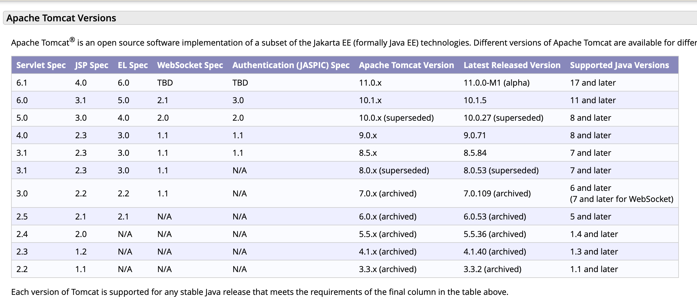 Tomcat은 엄밀히 말하면 WAS라기 보다 서블릿 컨테이너입니다. Servlet Spec과 JSP Spec이 지원되어야 하고, Java Version도 지원가능한지 확인합니다. 저는 회사 환경에선 Tomcat 6.0.53 버전을 archived 페이지에서 따로 다운 받았고, 개인 PC 환경에선 10.1.5 버전을 다운 받아보겠습니다.
