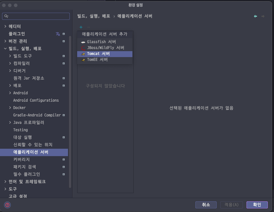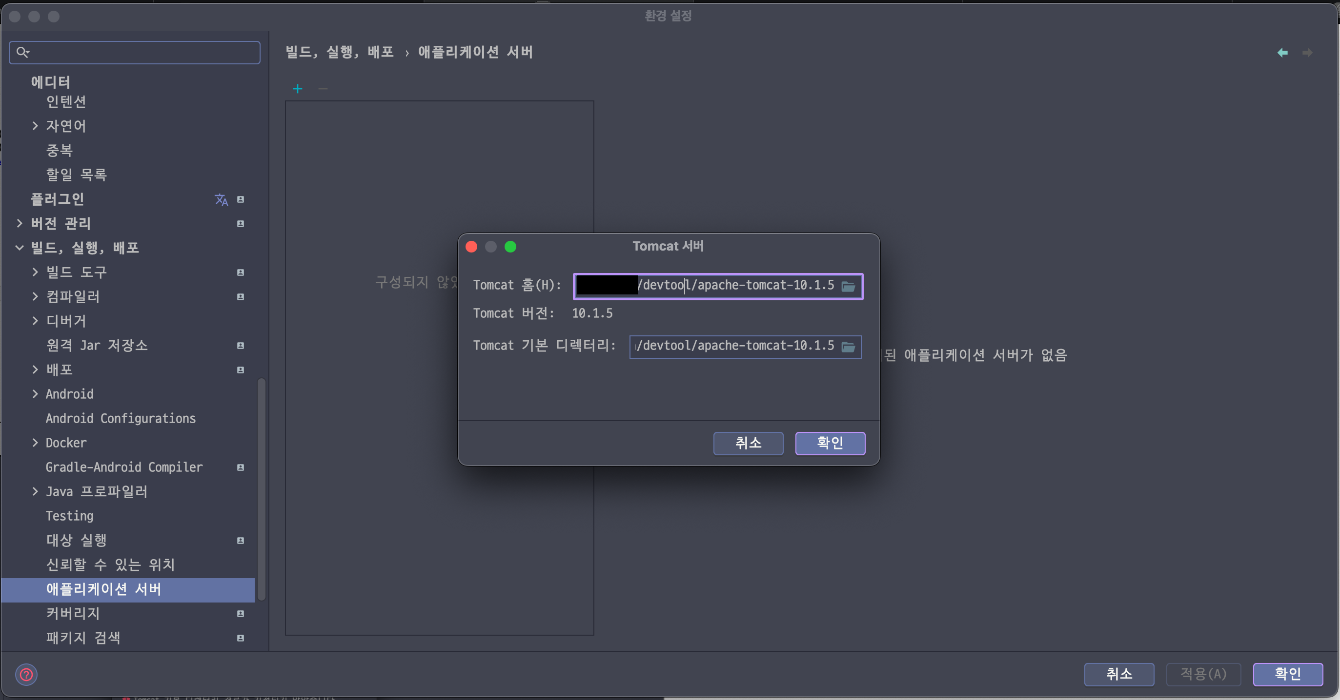 Tomcat을 설치했으면 Intellij에 셋팅해줍니다. 다운 받은 폴더 그대로를 Tomcat 홈으로 설정합니다.