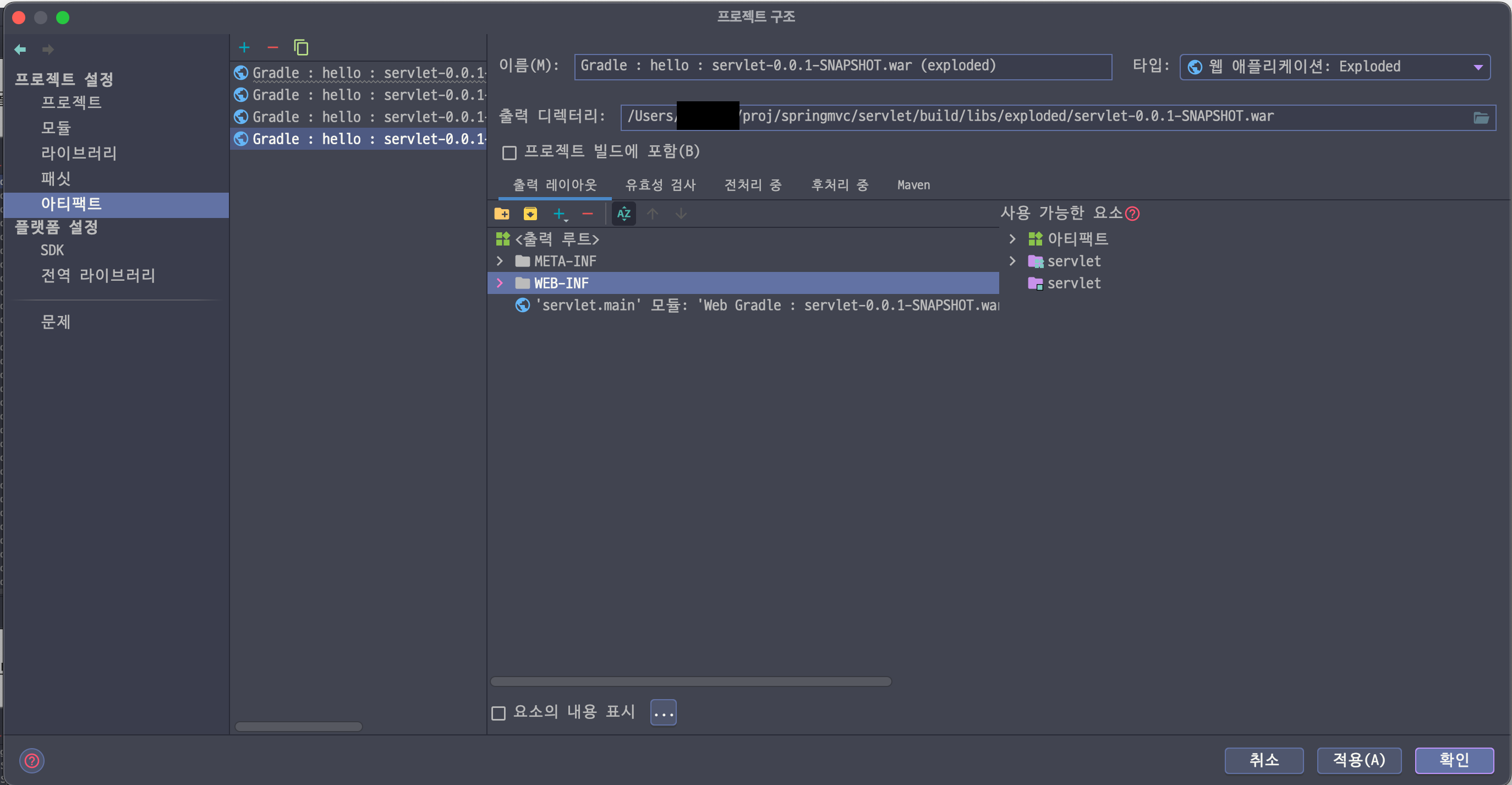 아티팩트 출력 루트 설정입니다. war Exploded로 배포하면 WEB-INF 아래로 배포가 됩니다. 저의 회사 환경에선 WEB-INF 아래에 lib 폴더가 있어서 괜찮았는데, 만약 다른곳에 있었다면 오른쪽에 사용 가능한 요소를 옮겨서 복사를 해줬어야 할거 같네요.