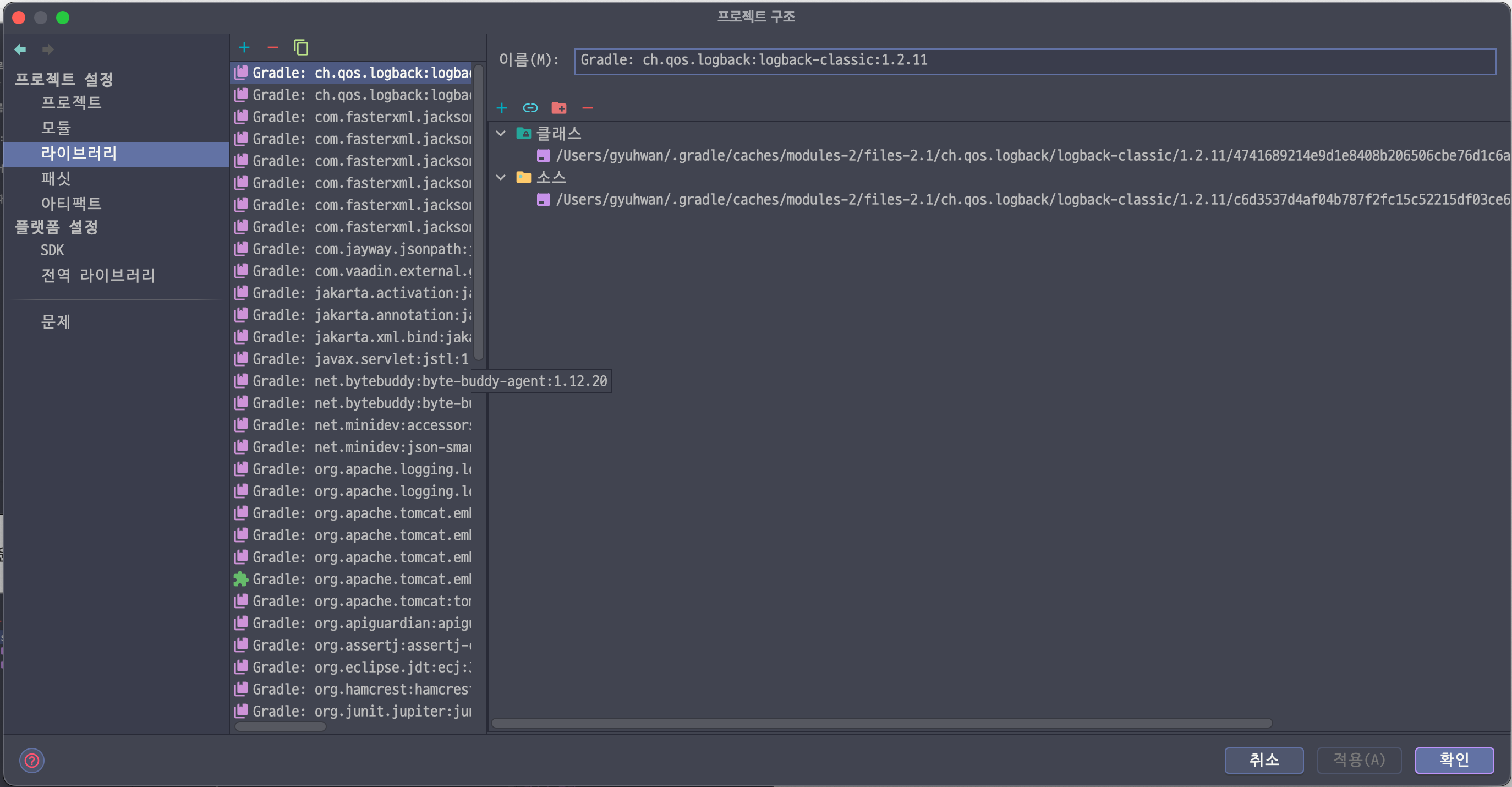 라이브러리에서는 프로젝트 내부 lib 폴더를 클래스로만 추가해 주었습니다. 저의 경우 모드 .jar 파일로 되어있습니다.