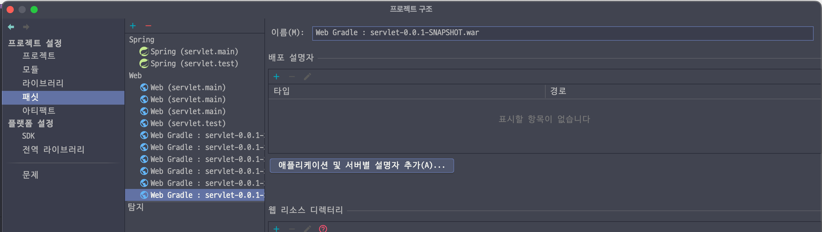회사에선 Web 아래 exploded 하나만 잡혔고, 그곳에 web.xml이 있어서 보였습니다. 현재 프로젝트에는 web.xml 이 없어서 보이지 않는데, 중요한 것은 좀 전에 META-INF/context.xml 을 복사했다면 이곳에 나와야 합니다. 없다면 애플리케이션 및 서버별 설명자를 추가하여 context.xml을 추가해주고 위의 설정을 해줍니다.
