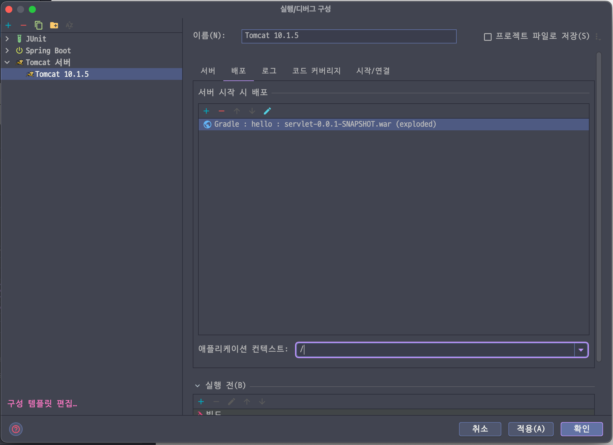배포 형식은 exploded를 사용했습니다. War를 사용하면 프로그램 수정 시 다시 .war 파일을 만들어야 합니다. exploded는 타겟 폴더에 업데이트된 항목에 대해서 copy를 진행합니다.