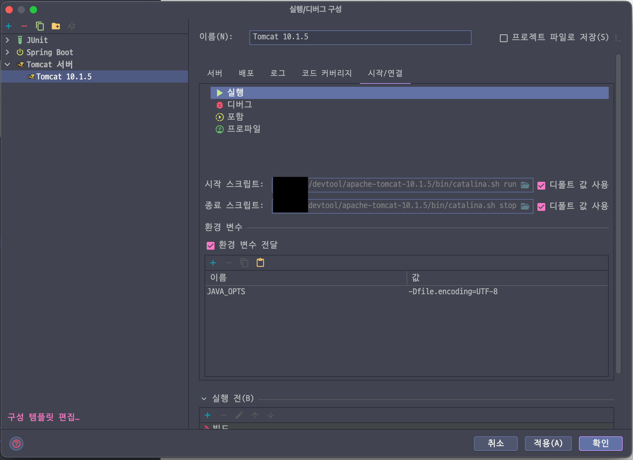 설정을 완료하고 저 오른쪽 실행 버튼을 누르면 설정한 Tomcat 홈 디렉토리에 있는 /bin/catalina.sh 파일이 호출됩니다.