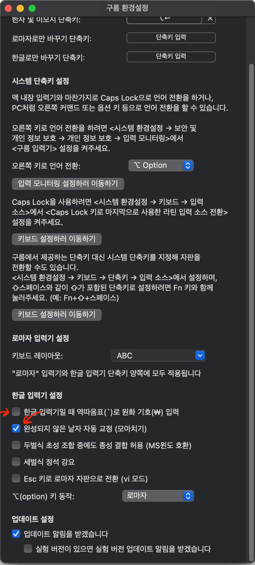 - "한글 입력기일 때 역따옴표(`)로 원화 기호 입력" => 체크 해제.