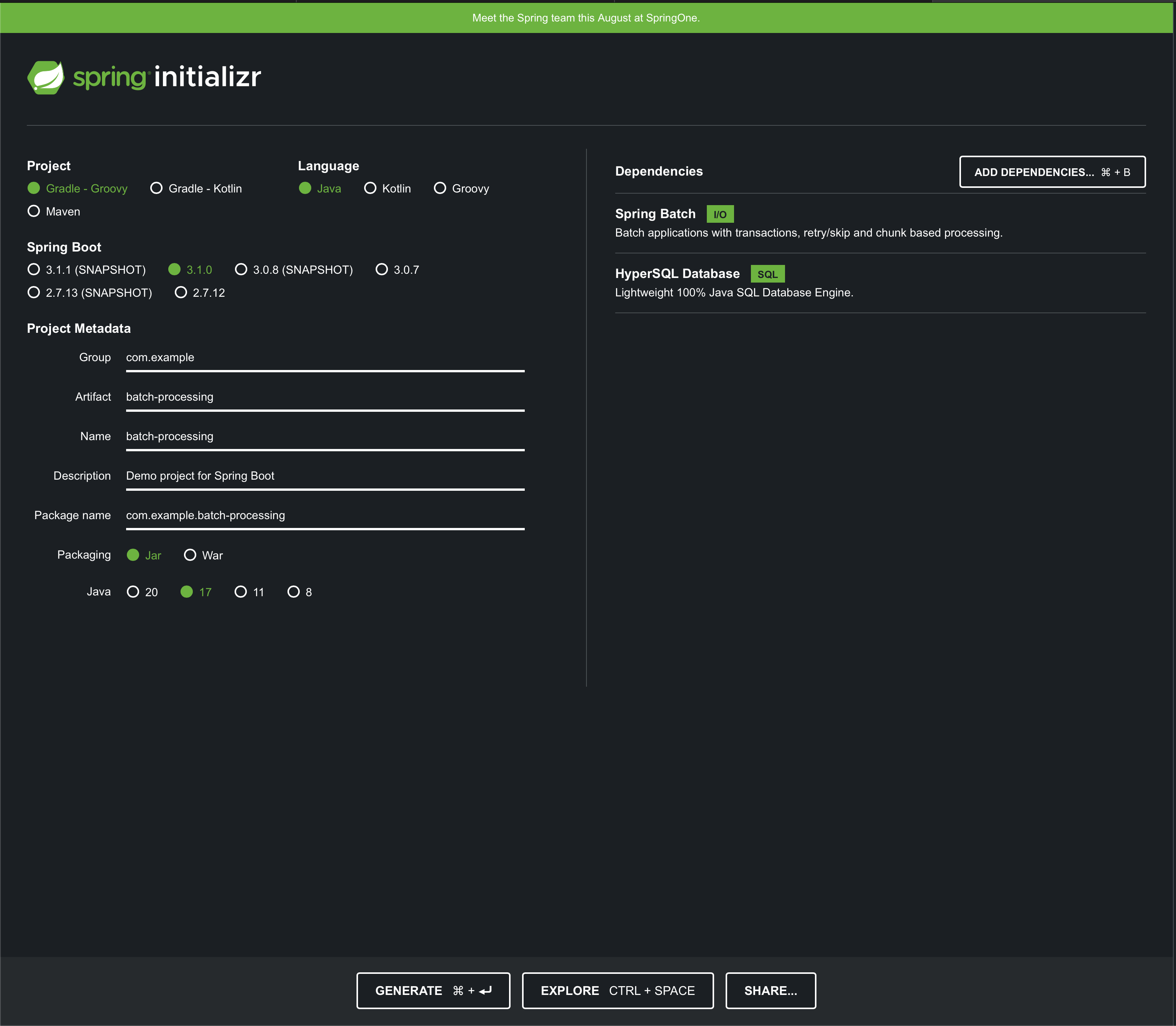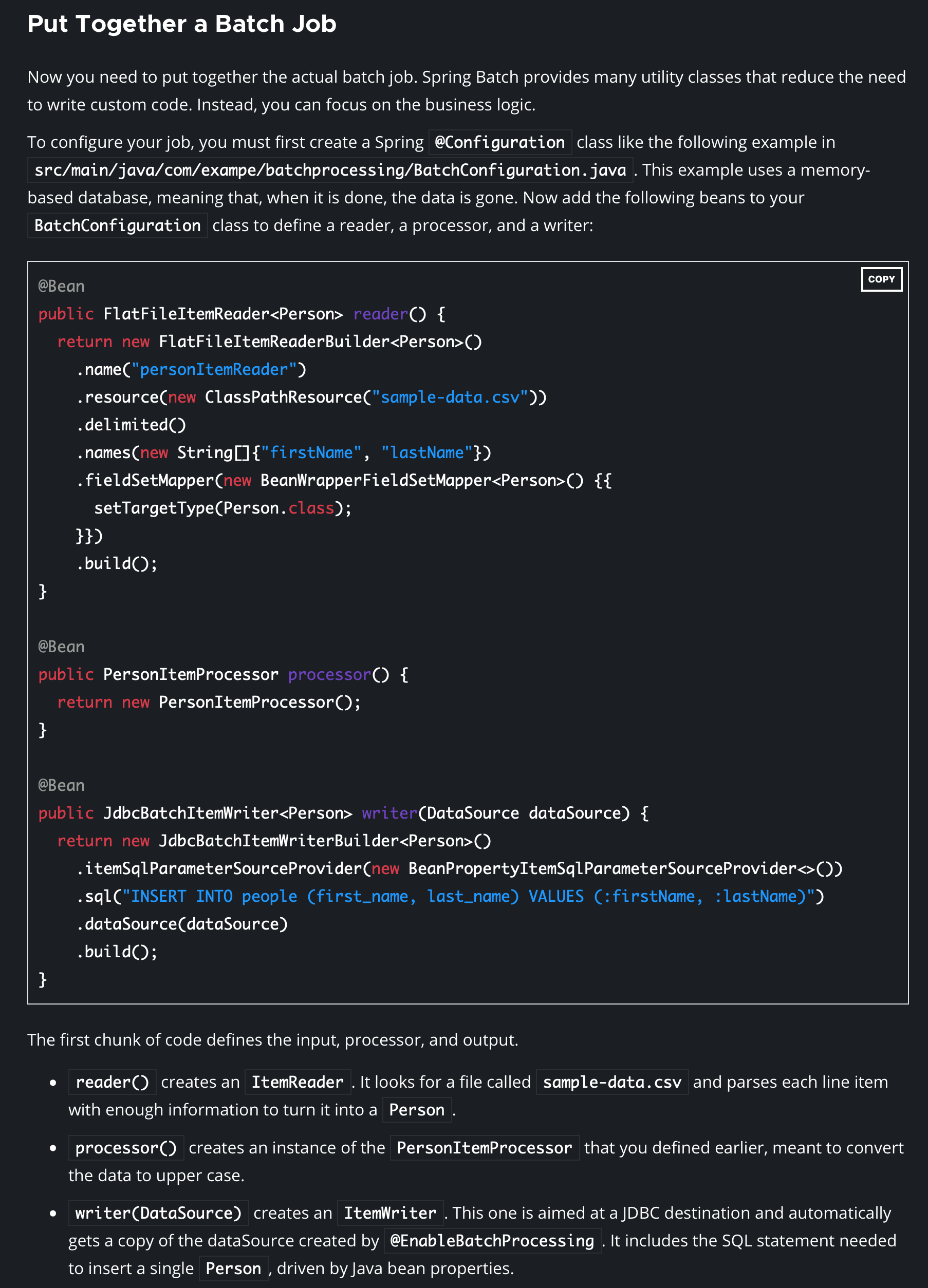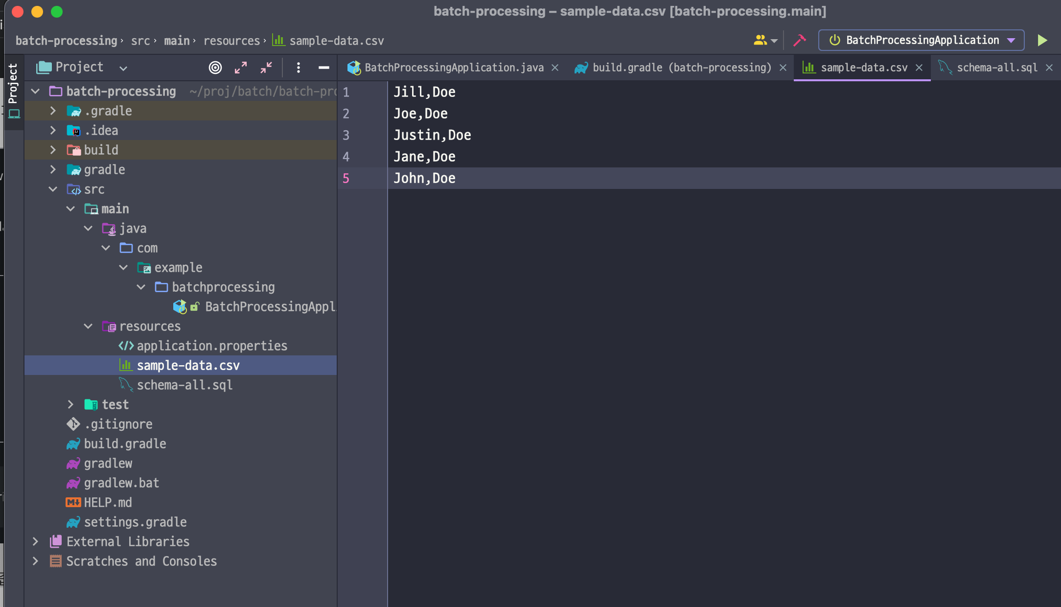 batch 프로세싱은 웹 애플리케이션 내에도 포함될 수 있지만, 이 예제에선 간단하게 단일 JAR 파일로 실행을 확인합니다.