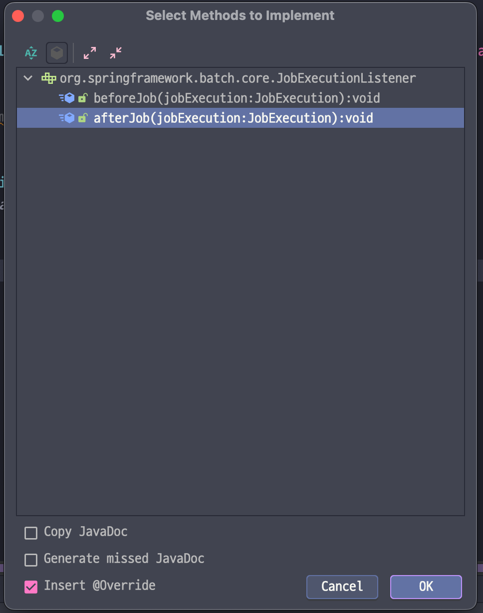 현재 원하는 내용은 Job이 완료되면, 데이터베이스에 쿼리를 날려 people 테이블을 조회하는 것이므로 afterJob을 오버라이드 해줍니다.