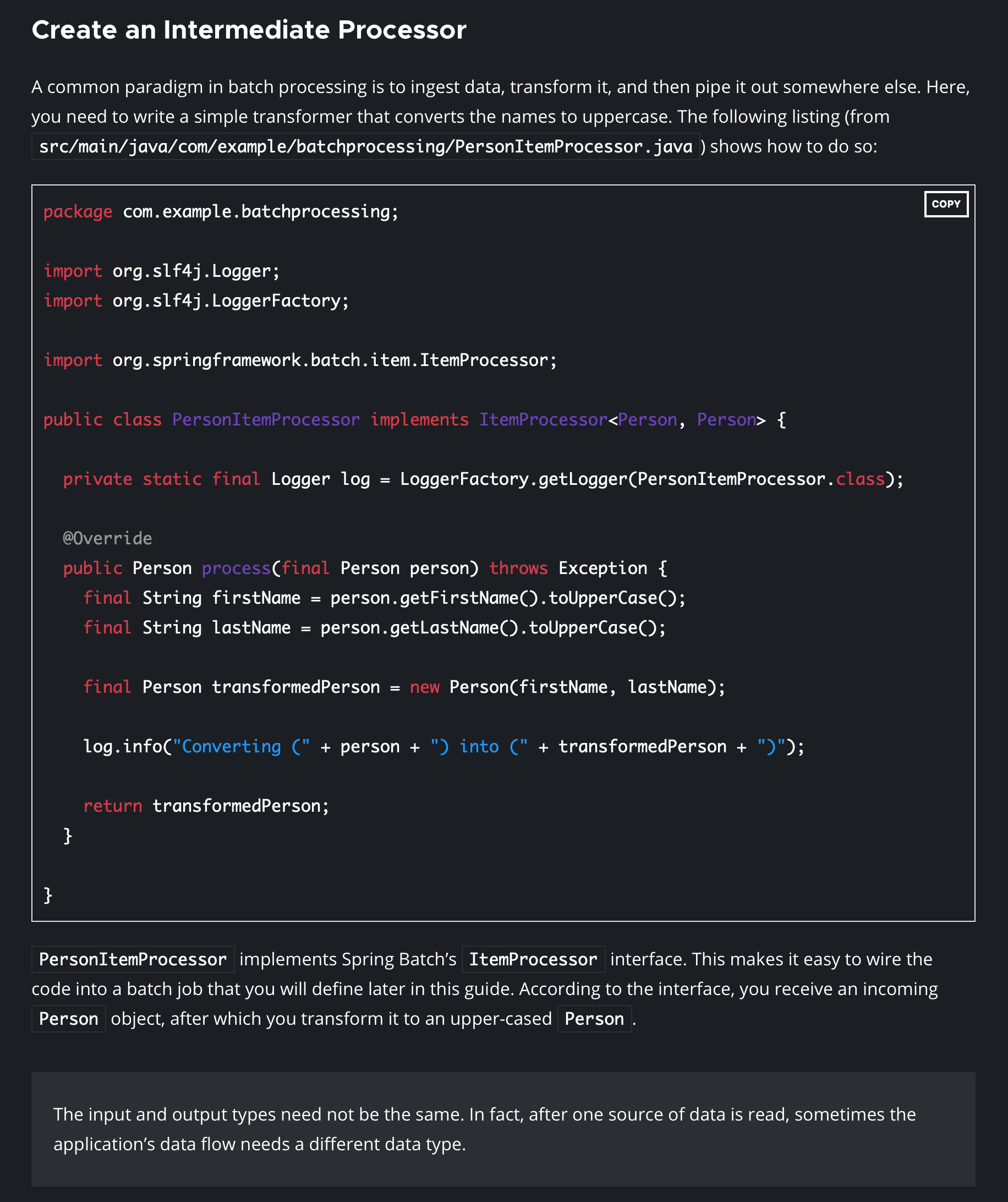 A common paradigm in batch processing is to ingest data, transform it, and then pipe it out somewhere else. Here, you need to write a simple transformer that converts the names to uppercase. The following listing (from src/main/java/com/example/batchproces