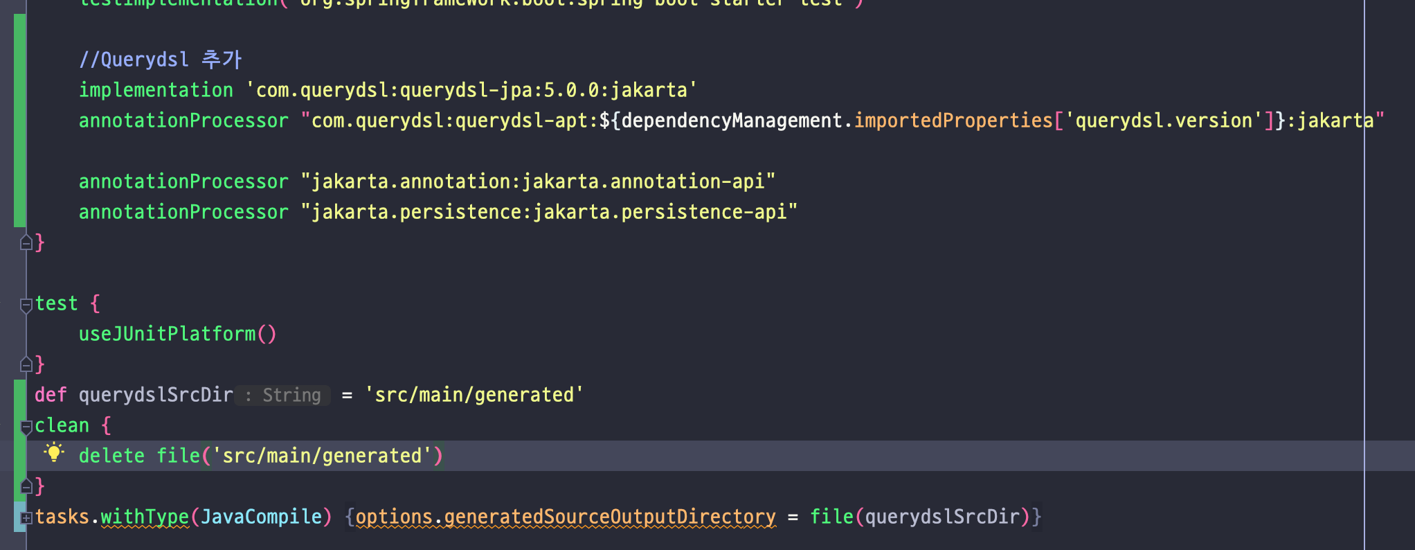 다음으로 Q타입이 Gradle의 JavaCompile을 통해 만들 수 있는 설정과, Q타입이 생성될 위치를 지정해줍니다.