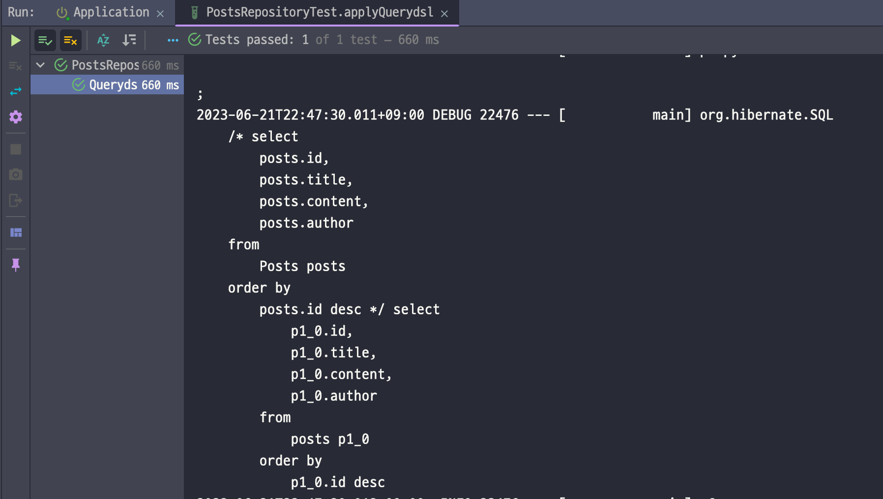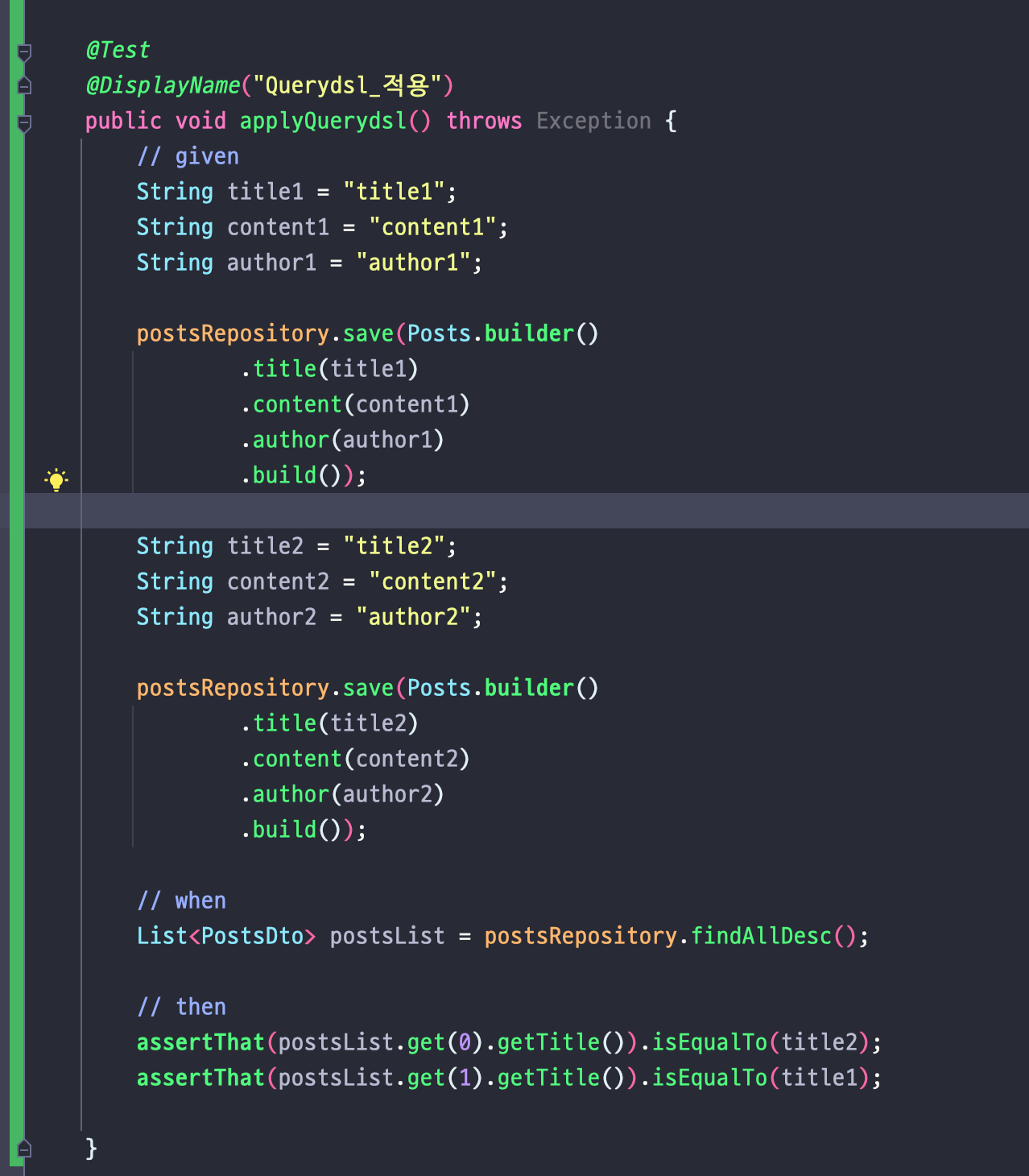 위에서 만든 메서드를 구현할 때 querydsl의 문법이 드디어 사용됩니다. Q타입의 static 필드인 QPosts.posts를 static import하여 쿼리를 깔끔하게 작성할 수 있습니다.