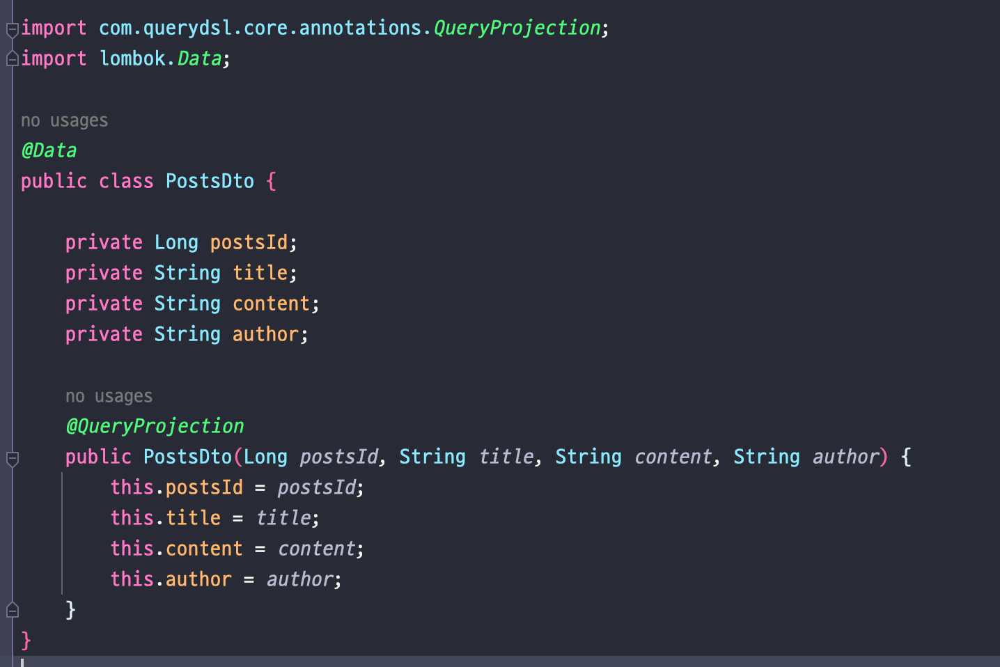 이 애노테이션은, 뒤에서 작성할 querydsl에서 Dto를 반환하는데 편리함을 제공합니다.