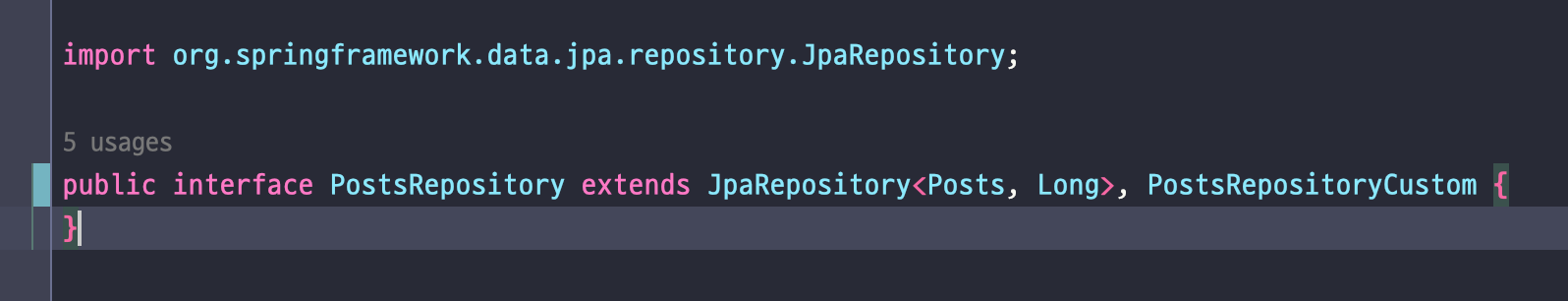 public interface PostsRepository extends JpaRepository<Posts, Long>, PostsRepositoryCustom {