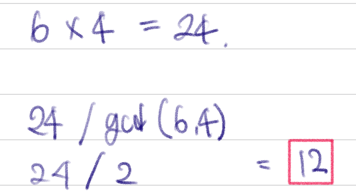 - 두 정수 A, B에 대하여 최소공배수는 (A x B) / 최대공약수