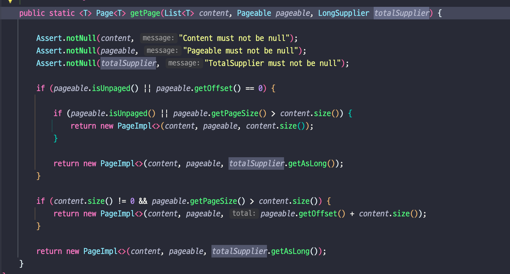 실제 getPage() 메서드를 확인해 보면, total count를 계산해야 하는 경우에만 LongSupplier를 호출하여 값을 계산하고 있습니다.
