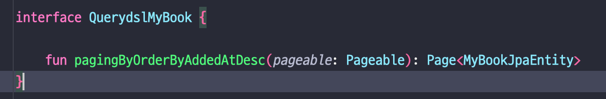 인터페이스 선언은 특별할 게 없습니다. 페이징 기능을 사용할 거라 Spring Data의 Pageable을 인자로, Page를 반환값으로 설정했습니다.