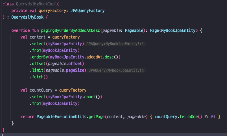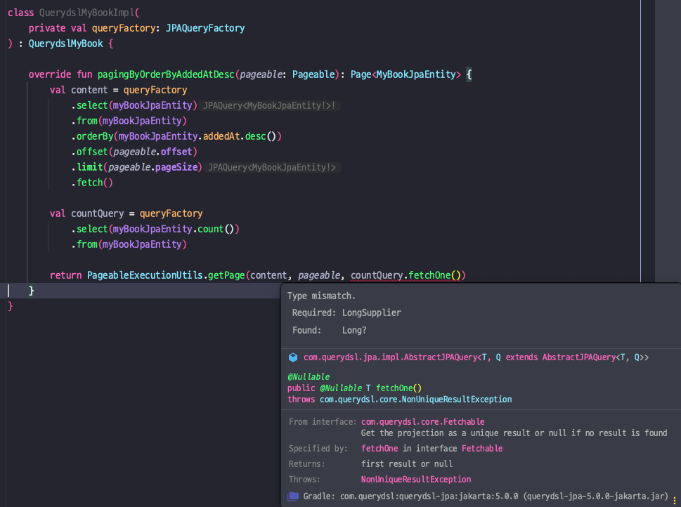 마찬가지로 Type missmatch 문제가 또 있었는데, PageableExecutionUtils.getPage() 메서드의 마지막 인자가 다음과 같이 LongSupplier로 되어 있습니다. 문제는 fetchOne() 메서드의 결과가 null을 허용하기 때문에 타입 불일치가 발생하고 있었습니다.