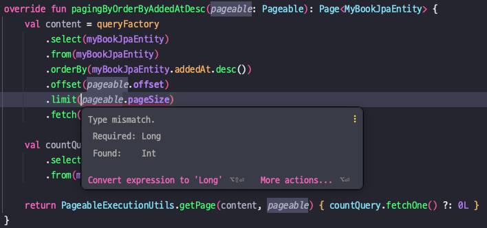 limit은 인자로 Long 타입을 받는데, pageable.getPageSize() 메서드는 int 값을 반환하고 있었습니다.