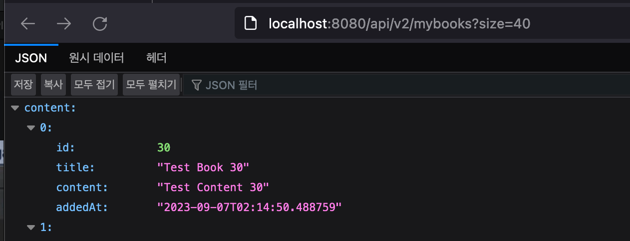 총 테스트 데이터를 30개를 넣었는데 size를 40개 요청하면 위에서 살펴봤던 LongSupplier의 getAsLong()이 호출되지 않을 것입니다. 따라서 count 쿼리도 나가지 않습니다.