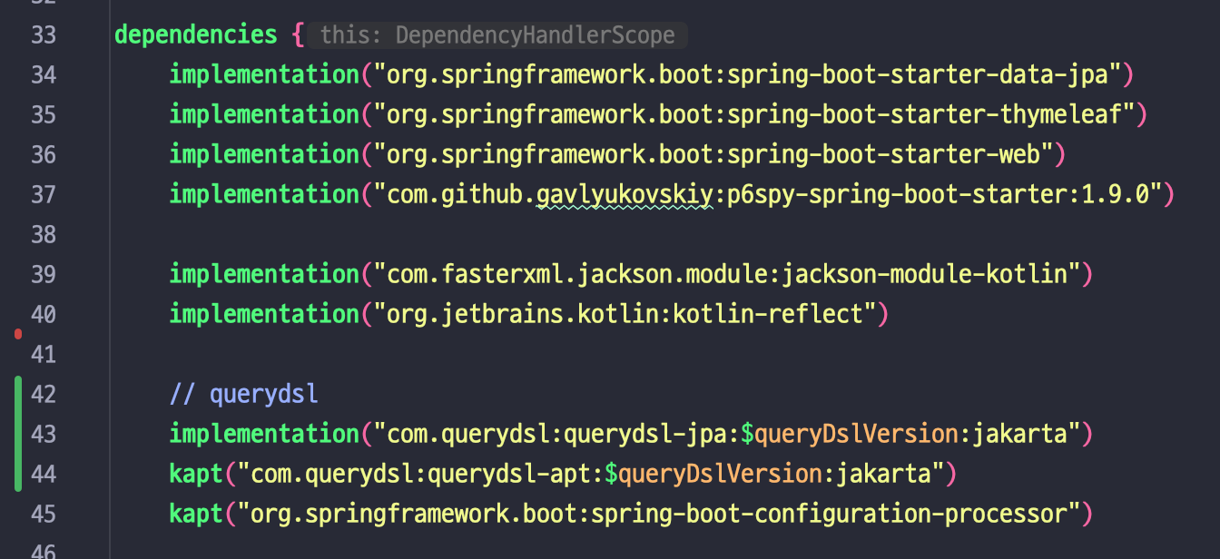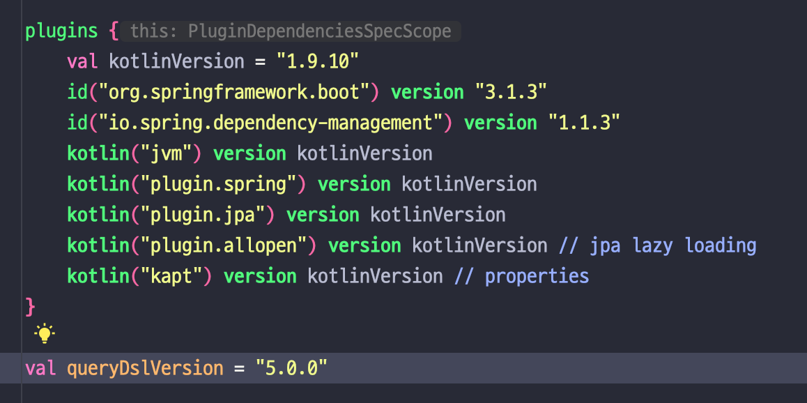 위에서와 같이 querydsl 버전을 변수로 선언해 주고, 디펜던시에 추가해 주었습니다.