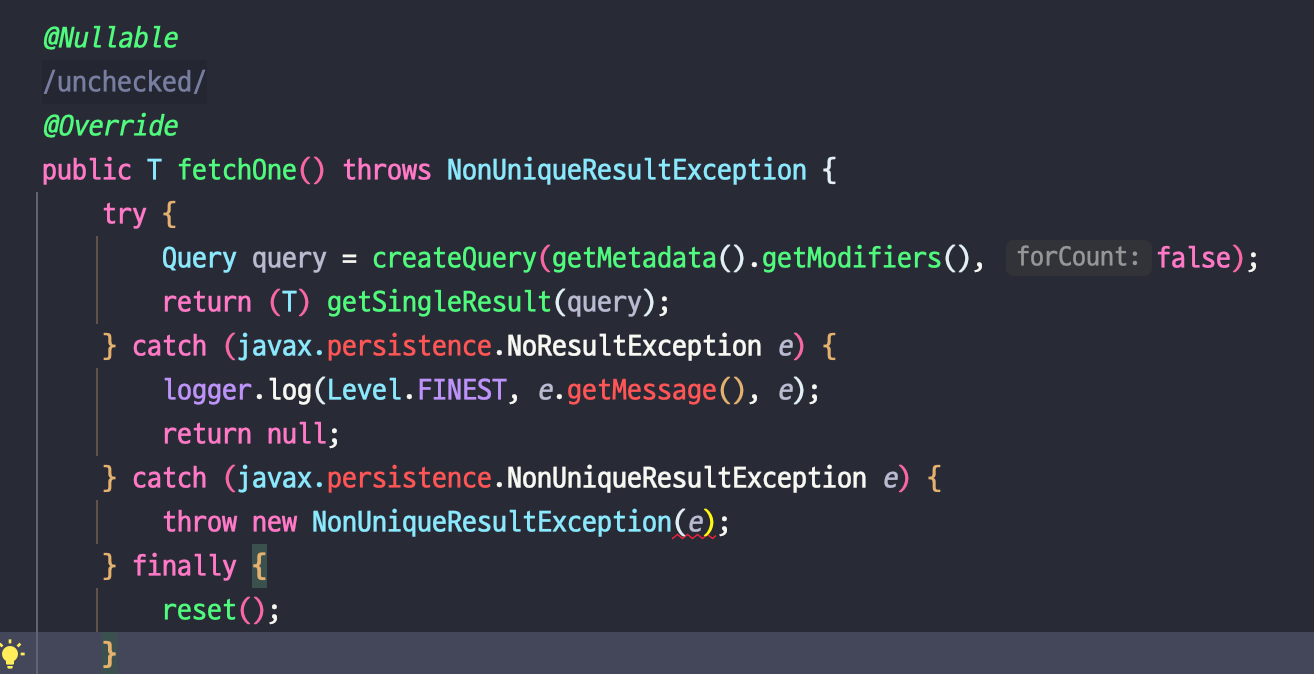 그런데 AbstarctJPAQuery 추상 클래스의 fetchOne() 메서드를 확인해 보면 null을 반환할 수 있게 되어있습니다.