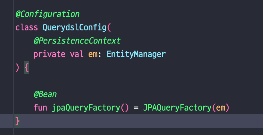 querydsl을 사용하는 클래스에서 엔티티 매니저를 주입받고, 생성자에서 JPAQueryFactory를 초기화해서 사용해도 되지만, 좀 더 편하게 사용하기 위해 설정 클래스에 빈을 선언해 주었습니다.