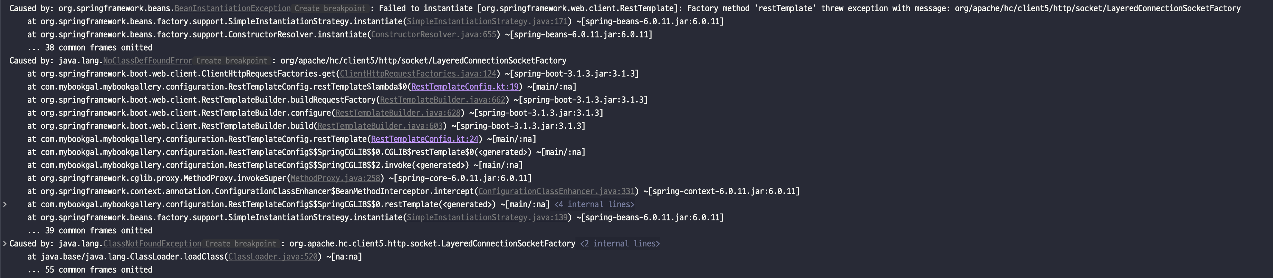 Caused by: org.springframework.beans.factory.BeanCreationException: Error creating bean with name 'restTemplateCustom' defined in class path resource [com/mybookgal/mybookgallery/configuration/RestTemplateConfig.class]: Failed to instantiate [org.springframework.web.client.RestTemplate]: Factory method 'restTemplate' threw exception with message: org/apache/hc/client5/http/socket/LayeredConnectionSocketFactory