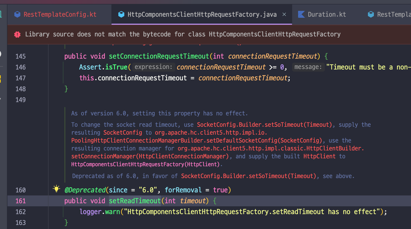 하지만 spring 6.0 부터는 RestTemplate를 설정할 때, HttpComponentsClientHttpRequestsFactory()에서 setReadTimeout() 메서드를 사용할 수 없습니다.