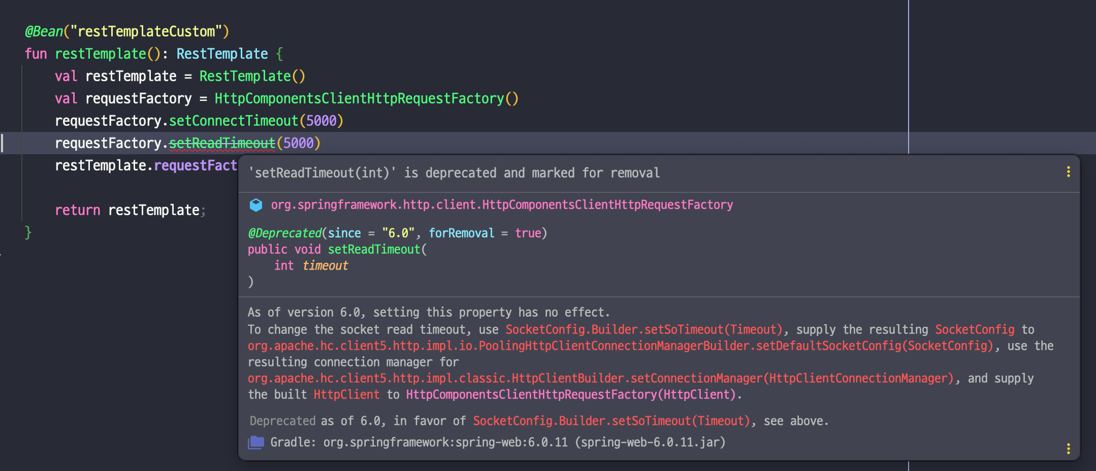 하지만 spring 6.0 부터는 RestTemplate를 설정할 때, HttpComponentsClientHttpRequestsFactory()에서 setReadTimeout() 메서드를 사용할 수 없습니다.